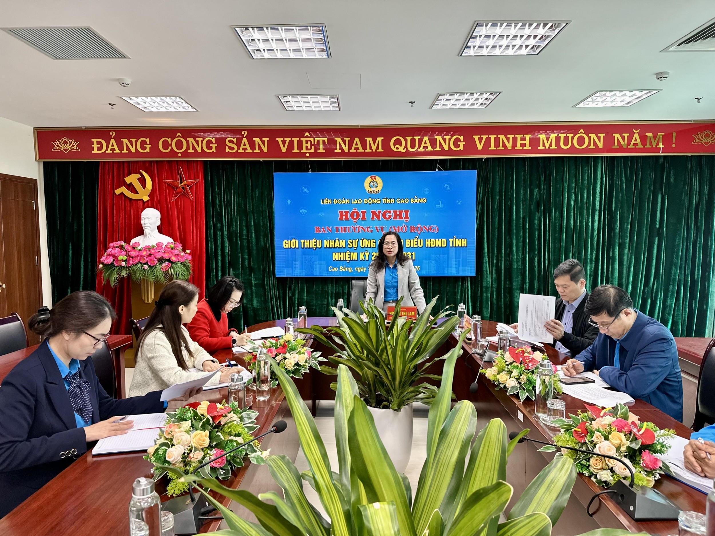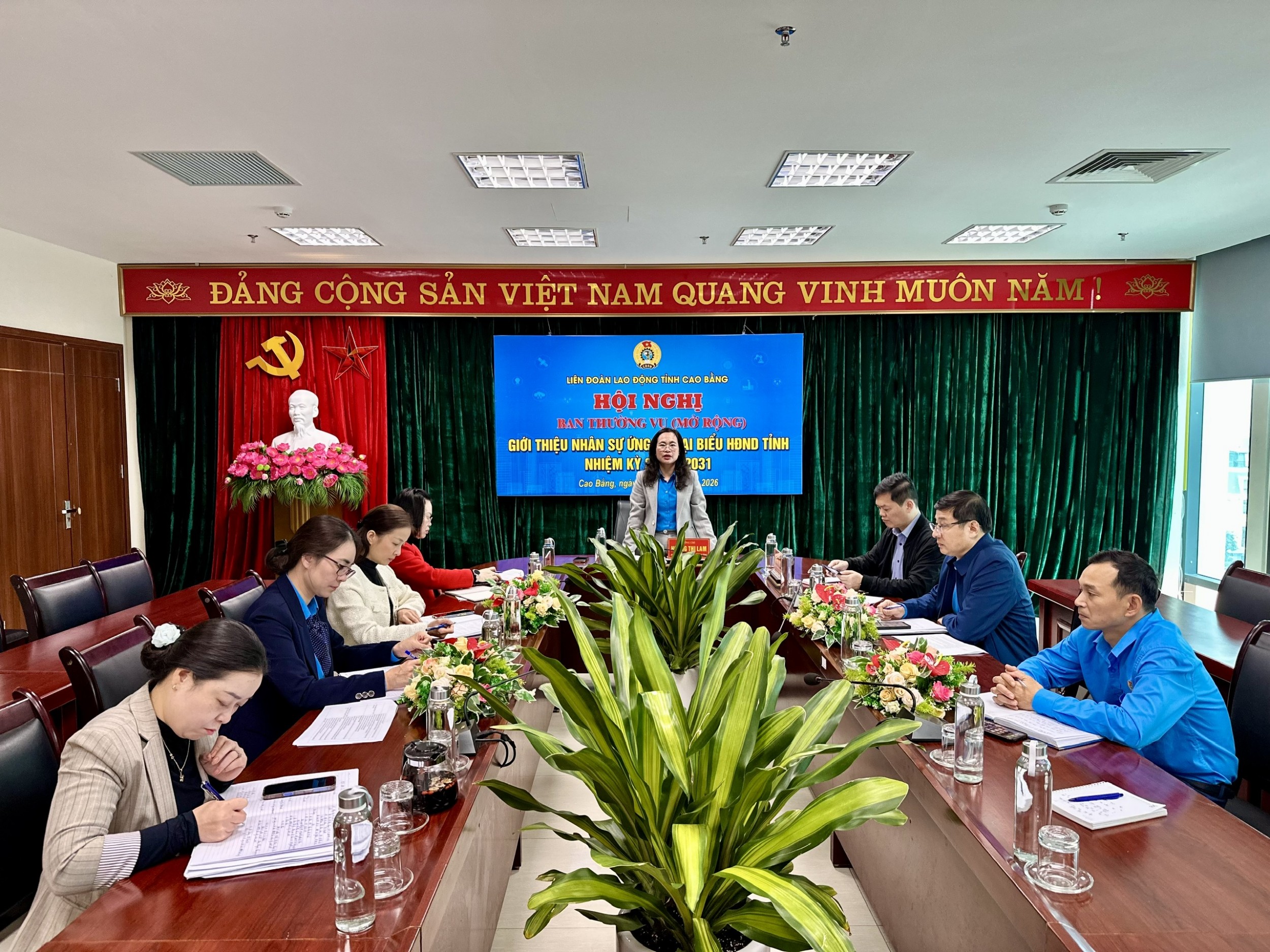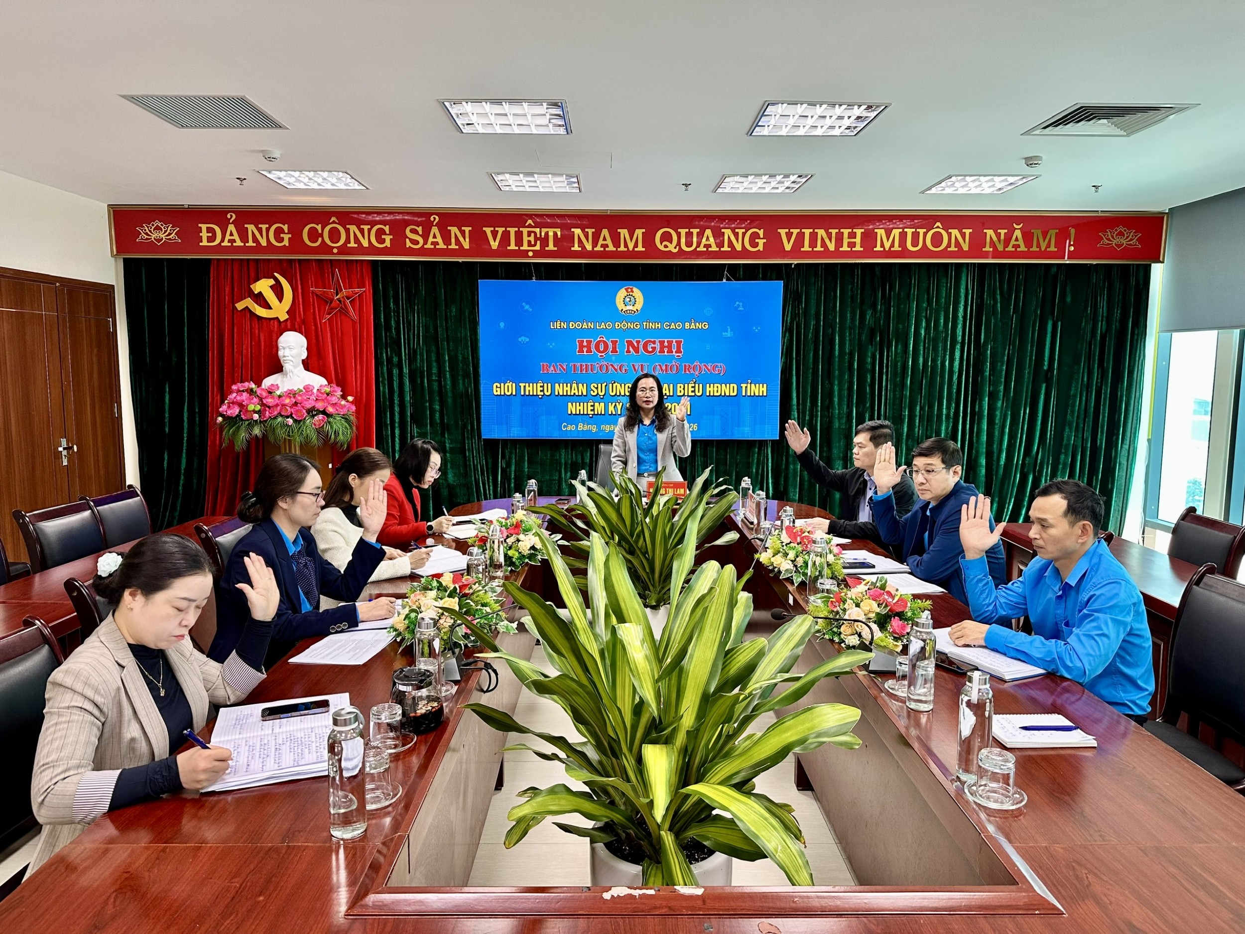 Kết luận hội nghị, Ban Thường vụ Liên đoàn Lao động tỉnh Cao Bằng cho biết sẽ hoàn thiện đầy đủ hồ sơ, thủ tục theo quy định, báo cáo Ban Thường trực Ủy ban Mặt trận Tổ quốc Việt Nam tỉnh đúng thời gian, góp phần thực hiện tốt các bước tiếp theo trong quy trình hiệp thương, chuẩn bị cho cuộc bầu cử đại biểu Hội đồng nhân dân tỉnh nhiệm kỳ 2026 – 2031.