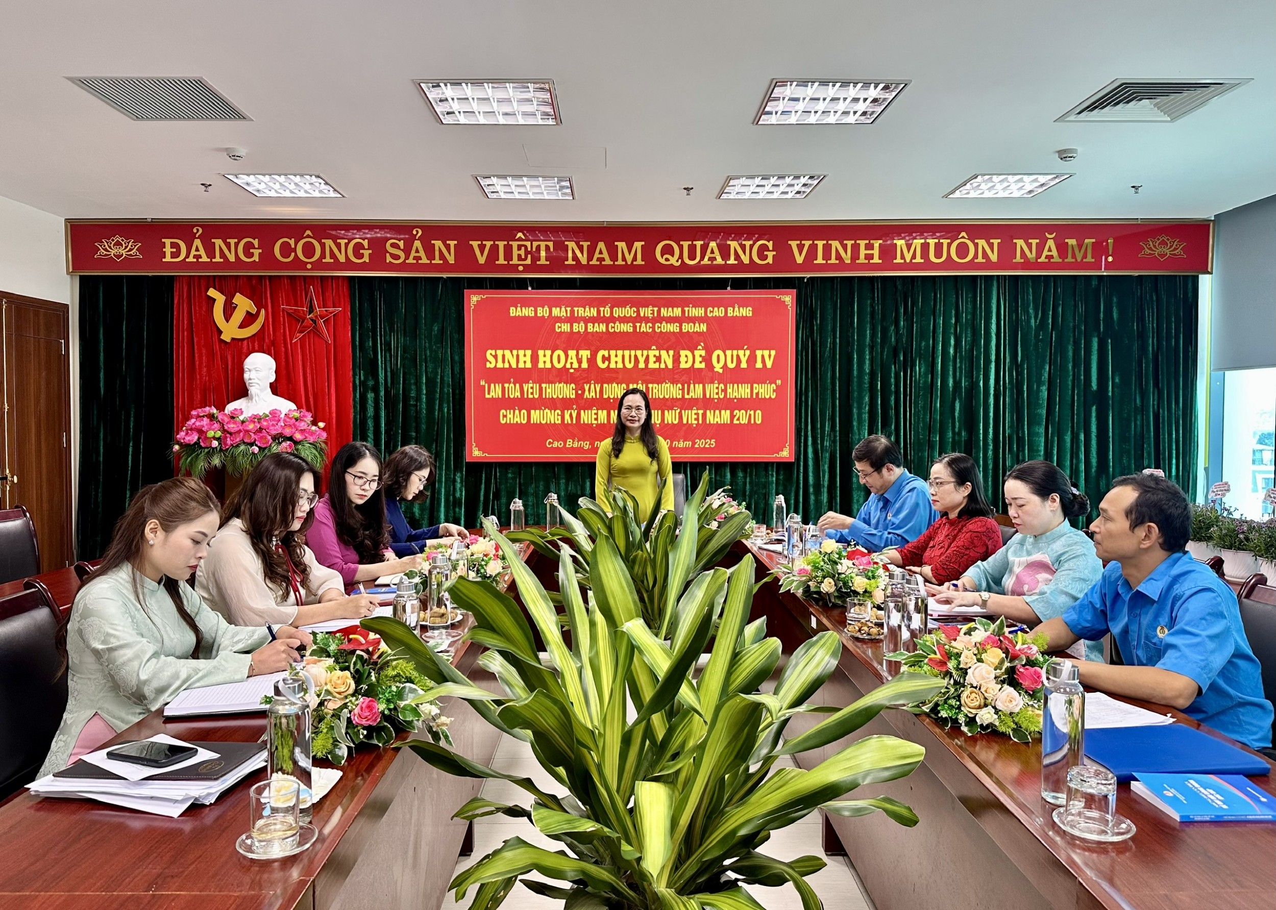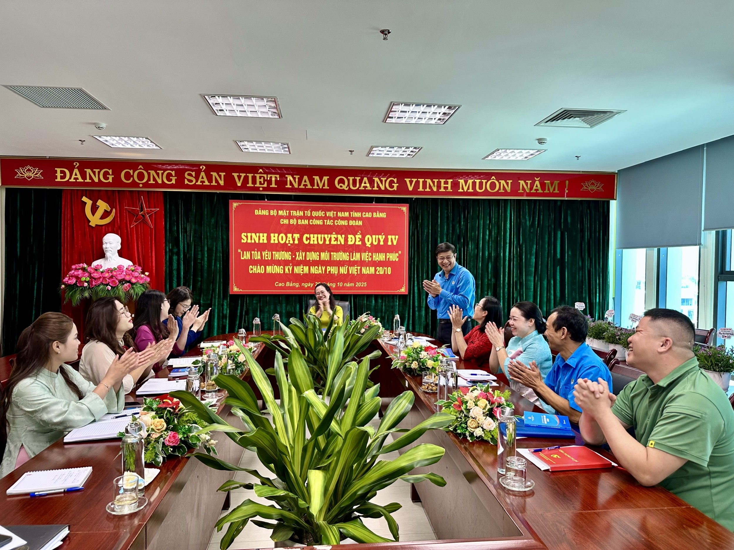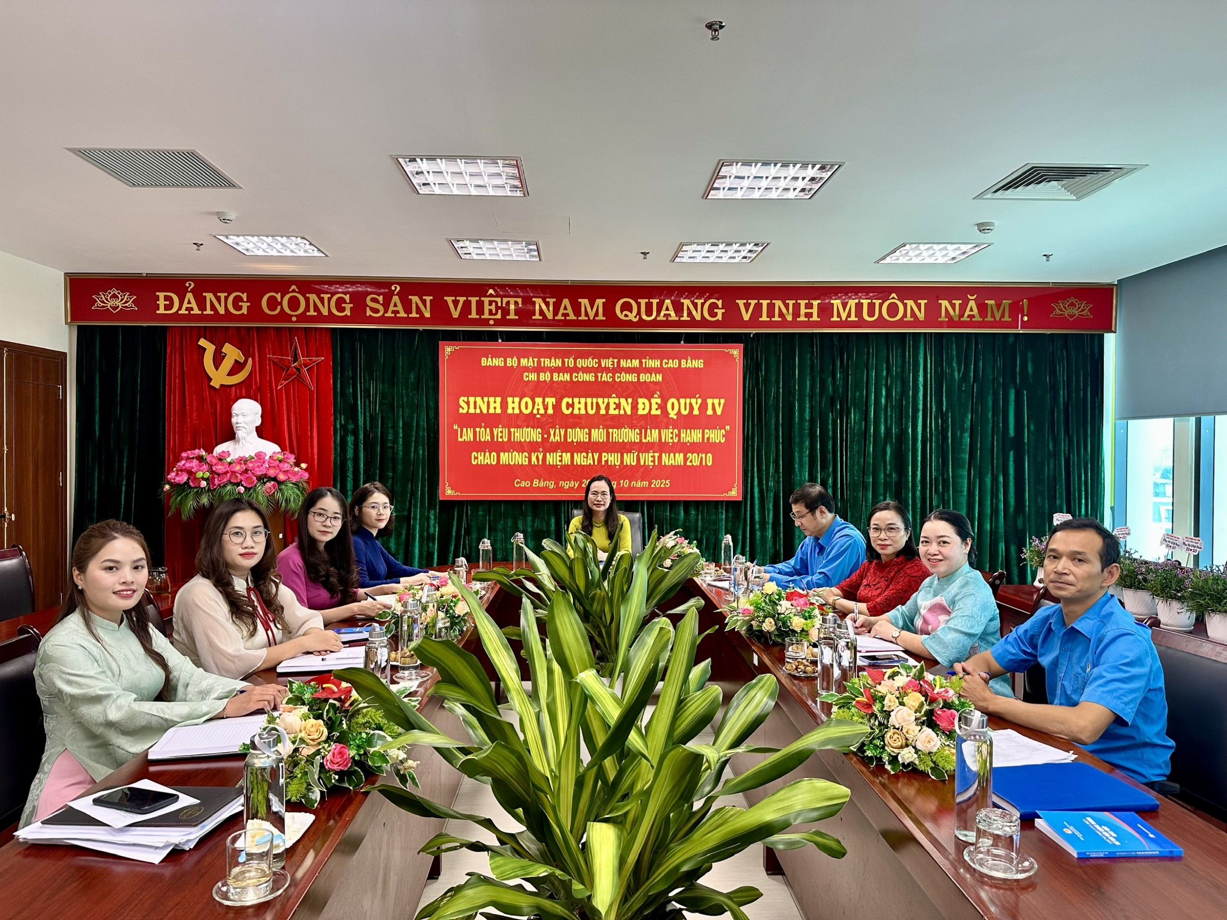 Hòa chung không khí rộn ràng chào mừng Ngày Phụ nữ Việt Nam (20/10), sáng ngày 20/10/2025, Chi bộ Ban Công tác Công đoàn tỉnh tổ chức sinh hoạt chuyên đề quý IV với chủ đề: “Lan tỏa yêu thương - Xây dựng môi trường làm việc hạnh phúc”.