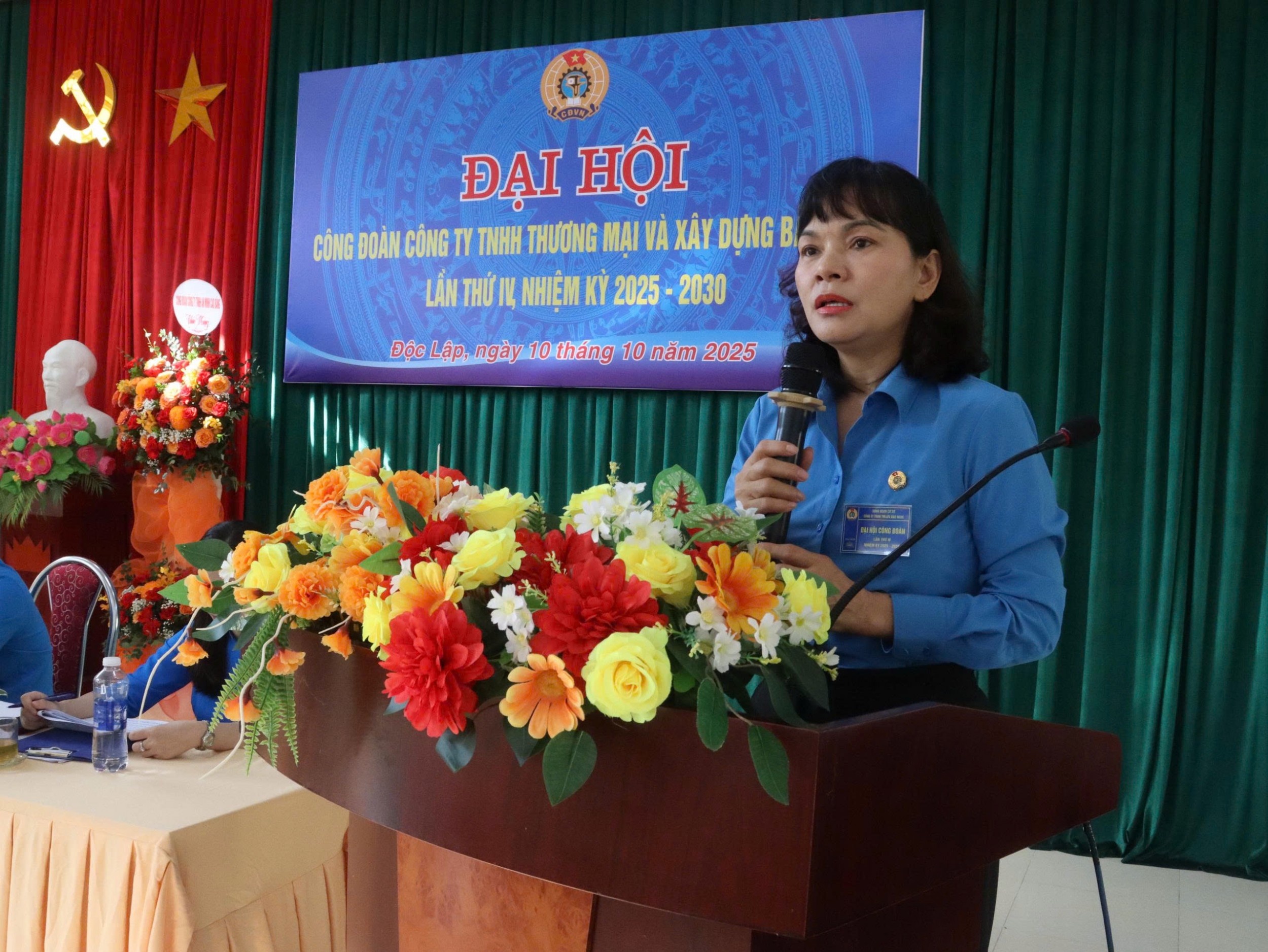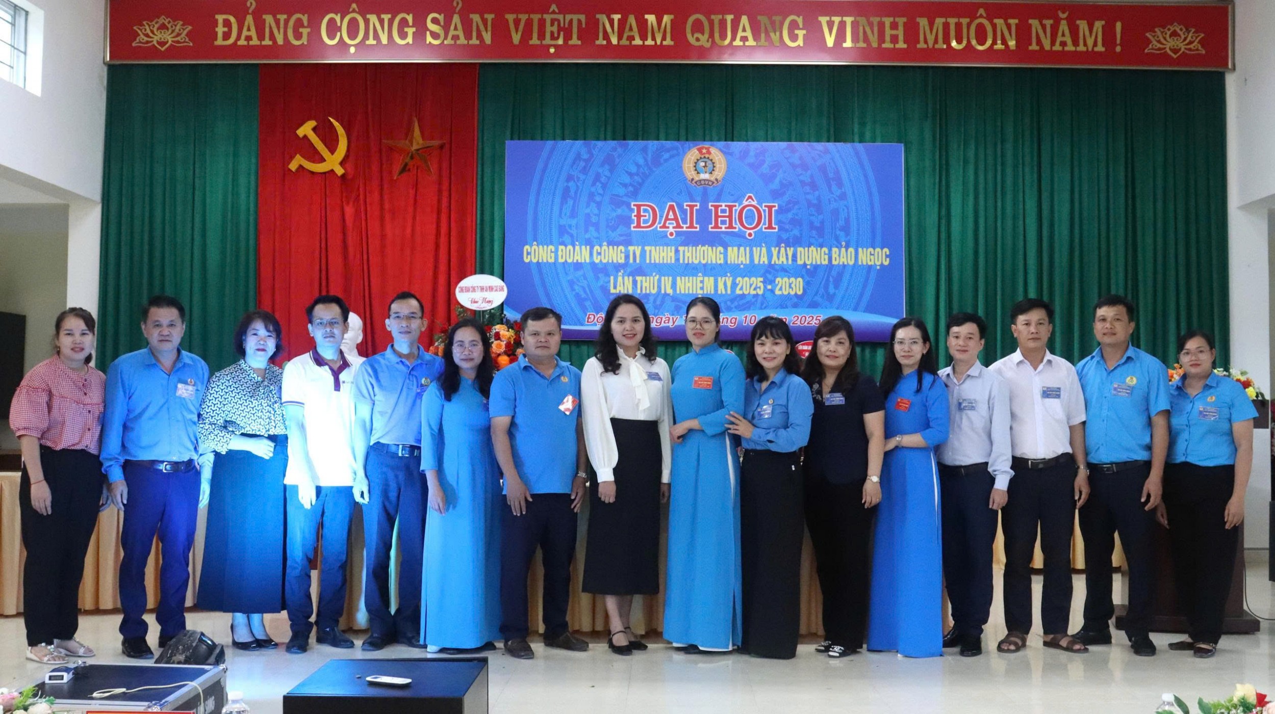 Chiều 10/10, Công đoàn cơ sở Công ty TNHH Thương mại & Xây dựng Bảo Ngọc long trọng tổ chức Đại hội lần thứ IV, nhiệm kỳ 2025-2030. Đây là 01 trong 02 đơn vị được Liên đoàn Lao động (LĐLĐ) tỉnh chọn tổ chức đại hội điểm để rút kinh nghiệm chỉ đạo Đại hội nhiệm kỳ 2025 - 2030. Dự Đại hội có các đồng chí: Hoàng Thị Lam, Phó Chủ tịch LĐLĐ tỉnh; Ngọc Thuý Oanh, Giám đốc Công ty, các đồng chí đại diện lãnh đạo cấp uỷ, chính quyền, đoàn thể xã Độc Lập; đại diện 23 đồng chí lãnh đạo các công đoàn cơ sở trực thuộc LĐLĐ tỉnh, trên địa bàn 12 xã, cùng 44 đại biểu chính thức của đại hội.