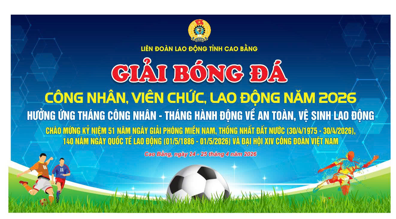 Hướng tới tổ chức các hoạt động thiết thực chào mừng Đại hội XIV Công đoàn Việt Nam; kỷ niệm 51 năm Ngày Giải phóng miền Nam, thống nhất đất nước (30/4/1975 - 30/4/2026), 140 năm Ngày Quốc tế Lao động (01/5/1886 - 01/5/2026), 136 năm Ngày sinh Chủ tịch Hồ Chí Minh (19/5/1890 - 19/5/2026) và các sự kiện trong Tháng Công nhân, Tháng hành động về An toàn, vệ sinh lao động năm 2026, Liên đoàn Lao động tỉnh Cao Bằng ban hành kế hoạch tổ chức Giải bóng đá Công nhân, viên chức, lao động năm 2026.