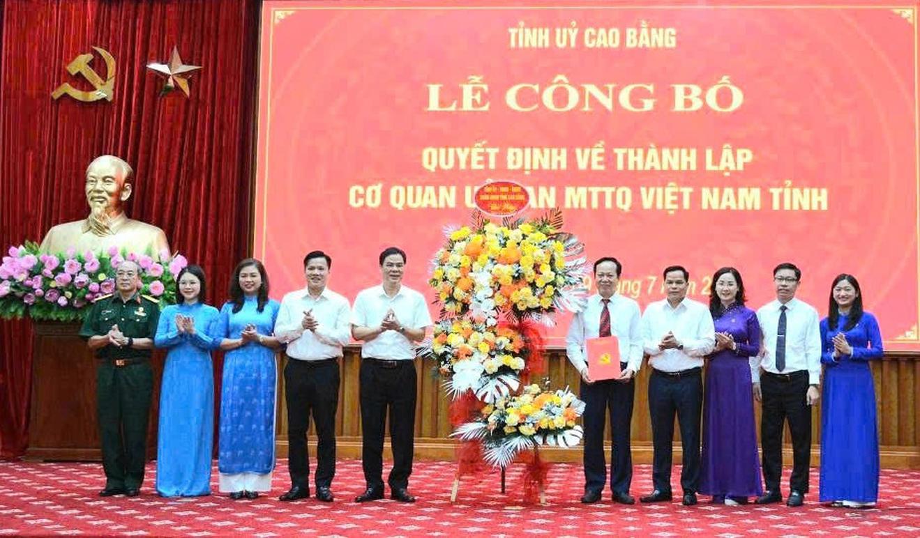 Hội nghị lần lượt công bố các Quyết định của Ban Thường vụ Tỉnh ủy về thành lập cơ quan Ủy ban MTTQ Việt Nam tỉnh với 10 ban tham mưu, giúp việc và 01 đơn vị sự nghiệp gồm: Văn phòng; các Ban: Tổ chức, kiểm tra; Dân chủ, giám sát và phản biện xã hội; Công tác Công đoàn; Công tác Nông dân; Công tác Thanh thiếu nhi; Công tác Phụ nữ; Công tác Cựu chiến binh; Tuyên giáo và Dân vận; Công tác xã hội và đơn vị Trung tâm hoạt động Thanh thiếu nhi. Quyết định của Uỷ ban Trung ương MTTQ Việt Nam về công nhận các chức danh trong Ban Thường trực Ủy ban MTTQ Việt Nam tỉnh Cao Bằng nhiệm kỳ 2024 - 2029, gồm 05 đồng chí. Đồng chí Vũ Đình Quang, Ủy viên Ban Thường vụ Tỉnh ủy giữ chức vụ Chủ tịch Ủy ban MTTQ Việt Nam tỉnh; đồng chí Vũ Khắc Quang, Tỉnh uỷ viên giữ chức Phó Chủ tịch Thường trực Uỷ ban MTTQ Việt Nam tỉnh; đồng chí Triệu Thanh Dung, giữ chức vụ Phó Chủ tịch Uỷ ban MTTQ Việt Nam tỉnh đồng thời là Bí thư Tỉnh đoàn Thanh niên Cộng sản Hồ Chí Minh; đồng chí Đoàn Thị Lê An, giữ chức vụ Phó Chủ tịch Uỷ ban MTTQ Việt Nam tỉnh đồng thời là Chủ tịch Hội Liên hiệp Phụ nữ tỉnh; đồng chí Nguyễn Thắng, giữ chức vụ Phó Chủ tịch Uỷ ban MTTQ Việt Nam tỉnh đồng thời là Chủ tịch Hội Cựu Chiến binh.